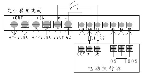 定位器與電動執(zhí)行器通過一個七線接插件連接,其中定位器上GND端可以與電動機執(zhí)行器外殼連接或懸空不接;RO、RV、RS分別接電動執(zhí)行器內(nèi)的反饋電位器的三個端子,其中RV接電位器的滑臂,RO接執(zhí)行器開動作與滑臂之間電阻不斷減小一端,RS則接另一端;SHUT、OPEN、COM分別接執(zhí)行器伺服電機的閉、開、COM端子。